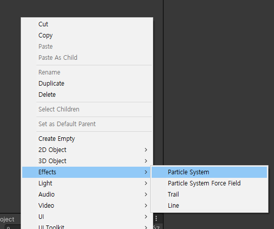 그 중에 .Effects -> Particle System 을 눌러 새로운 오브젝트를 생성한다.